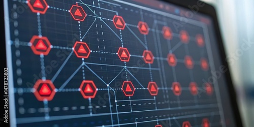 Digital interface displaying network connections with red warning symbols, suggesting a focus on cybersecurity or system monitoring.