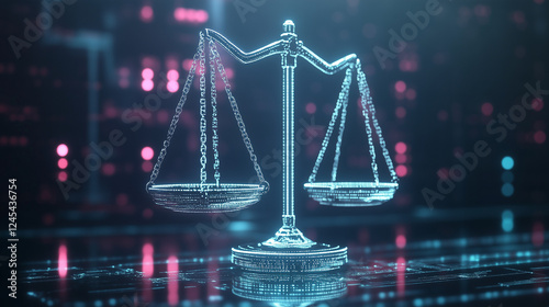 Digital Justice: A stylized rendering of a scales of justice, composed of glowing digital particles.