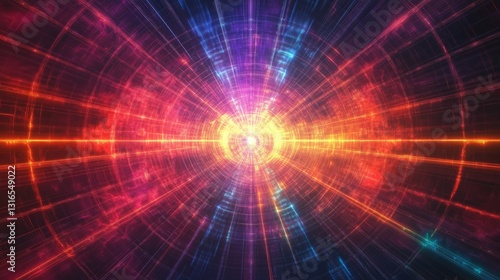 Digital Landscape Featuring a Central Glowing Blue Sphere, Connected by Intricate Lines and Patterns, Surrounded by a Sci-Fi Aesthetic of Pink and Purple Lights.