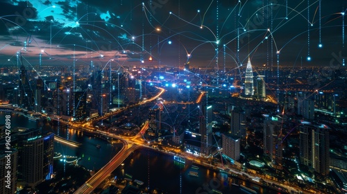 Digital landscape photography of Asia, global network connectivity, cyber technology, data transfer, business exchange, information and telecommunications.