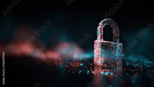security, padlock, digital, glowing, particle, technology, protection, datum, privacy, encryption, safety, secure, cyberspace, online, lock, access, system, information, code, network, cyber, virtual, abstract, three-dimensional, graphic, design, dark, background, red, blue, dot, pattern, light, illuminated, element, symbol, tech, modern, future
