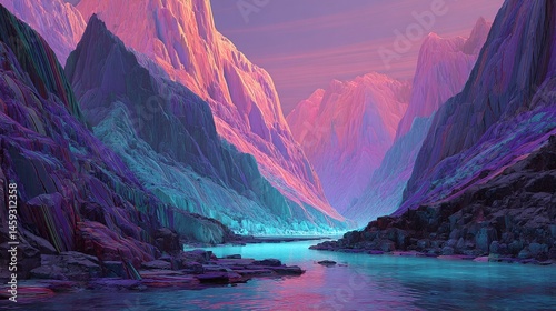landscape, mountain, river, canyon, art, colourful, purple, pink, blue, water, rock, vale, scenic, nature, fantasy, illustration, artistic, vibrant, peaceful, serene, calm, tranquil, background, wallpaper, dreamy, aethereal, majestic, beautiful, scenery, vista, horizon, outdoors, environment, wilderness, artwork, digital artwork, gradient, pastel, light, shadow