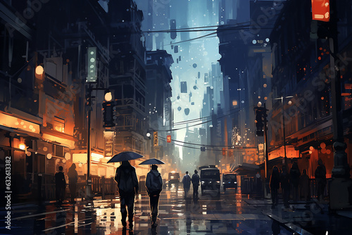Digital painting of classic city at night time with light of lamps, Generative AI