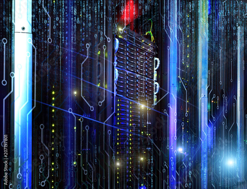 Digital Perspectives series. Abstract design made of numbers, light grids and fractal elements on the fantastic view of the mainframe in the data center rows