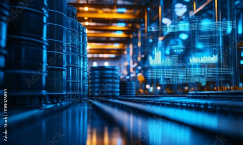 Digital Petroleum Distribution Data Above Stacked Gasoline Barrels in Industrial Warehouse - Realistic Style with Cool Blue Tones