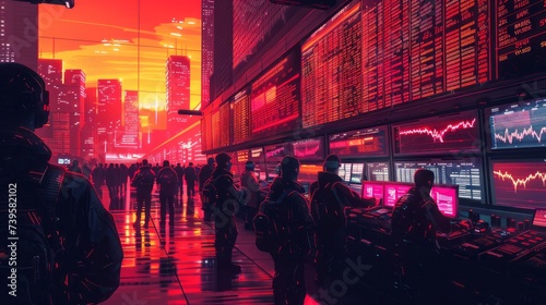 Digital rendering of a futuristic stock exchange, where traders interact with holographic displays and virtual reality interfaces to execute trades in real-time