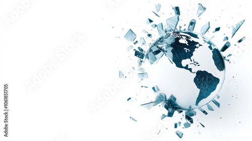 digital representation of Earth shattering into pieces, showcasing transparent and abstract design. globe features network pattern, symbolizing connectivity and fragility