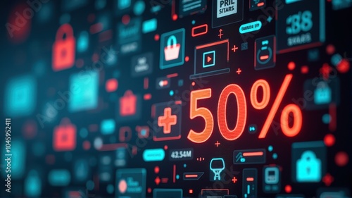 Digital sale display featuring a bold "50%" in red, surrounded by technology icons and symbols, conveying a high-tech shopping experience.