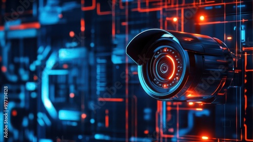 Digital security camera monitoring a glowing, high-tech environment, sharp metallic details, intense colors