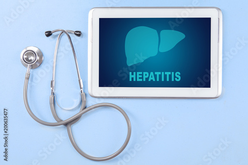 Digital tablet with hepatitis word and stethoscope