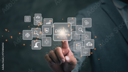 Digital Transformation & Marketing Strategy: Hand Interacting with Virtual Technology Icons for Business Innovation