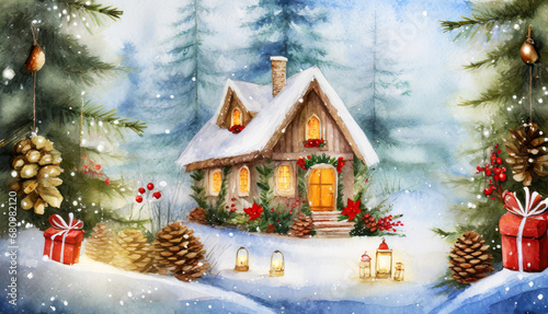 Digital water color illustration of a cozy wooden Christmas cabin in the woods with holiday themed decorations in a snow winter wonderland landscape. ai generated.