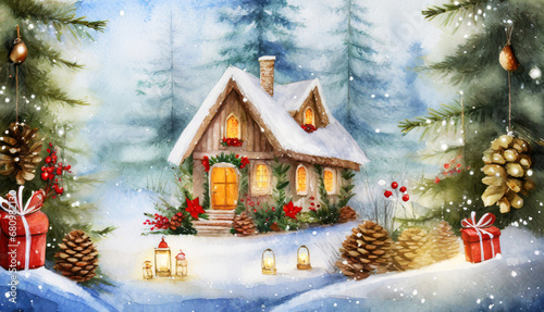 Digital water color illustration of a cozy wooden Christmas cabin in the woods with holiday themed decorations in a snow winter wonderland landscape. ai generated.