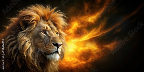 Digitally enhanced lion head silhouette with a powerful gaze, lion, big cat, wild animal, strength, powerful