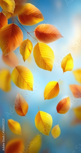 autumn, leaf, foliage, fall, gold, yellow, orange, sky, blue, branch, drift, falling, blurred, soft, sunlight, bright, season, nature, background, vertical, painted, digital, art, illustration, beauty, calm, serene, peaceful, tranquil, light, shadow, vibrant, colours, airy, dreamy, aethereal, gentle, delicate, detail, texture, warmth, october, november, colourful, gradient, natural, scenic, vista, depth