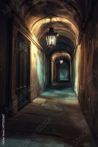 hallway, dimly, lit, lantern, ceiling, dark, mystery, horror, scene, eerie, abandoned, empty, isolated, alone, solitary
