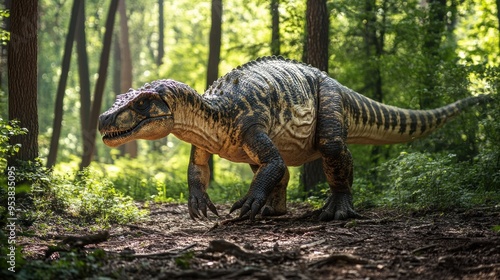 dinosaur, forest, prehistoric, reptile, animal, nature, green, leaf, tree, wood, ground, path, wildlife, creature, extinct, ancient, jungle, fauna, biology, paleontology, science, evolution, jurassic, cretaceous, zoology, scale, tail, claw, teeth, eye, head, body, leg, foot, feather, skin, sharp, powerful, fierce, mighty, large