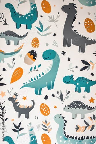 dinosaur, egg, pattern, children, cute, design, art, colourful, playful, leaf, illustration, green, grey, orange, blue, childcare center, fabric, wallpaper, habitat, prehistoric, toy, cartoon, forest, nature, modern, fun