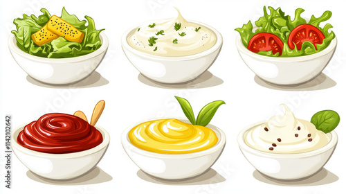 Dip sauce bowl set with mustard, mayonnaise, ketchup and cheese cream. Bbq and yogurt condiment dressing cartoon design. Different salad ingredient cup in menu. Yellow sour yoghurt and mayo for dish