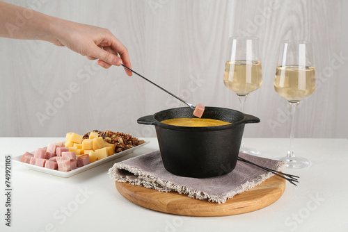 Dipping piece of ham into fondue pot with tasty melted cheese at white table, closeup