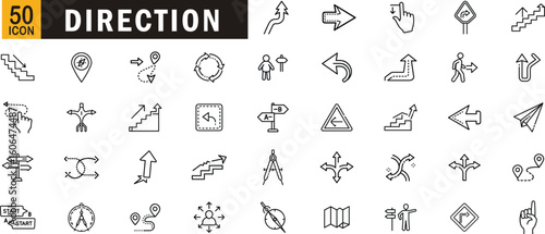 Direction editable outline icon set. Arrows, signs, compass, route, turn, stairs, gesture, map, path and more