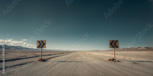 chevron, signs, road, desert, arid, mountain, sky, horizon, directional, desolate, empty, journey, rural, wilderness, landscape, barren, remote, dusty, path, travel, expansive, direction, guidance, isolated, open, huge, highway, terrain, dirt, unmarked, adventure, southwestern, navigation, solitude, crossroad, driving, daytime, sunny, route, distance, dry, curve, caution, unpaved, dirt road, directional signs, open road