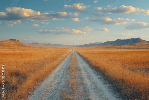 Dirt road stretches through golden plains under a blue sky with scattered clouds