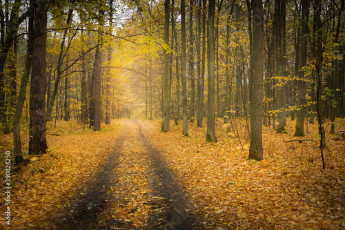 road, forest, path, yellow, autumn, orange, leaf, tree, timberland, dirt, park, october, light, wood, nature, fall, season, landscape, rural, colours, country, foliage, travel, gold, through, colours, deciduous