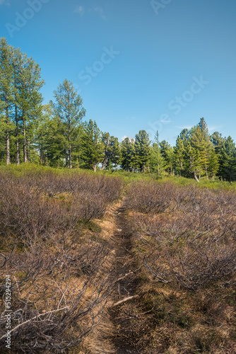 Dirt trail in summer forest. Walk through park on sunny day. Jogging over rough terrain. Hiking in mountains