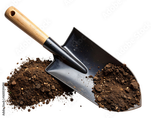 “Dirty Shovel with Soil Clumps on Blade, Worker’s Tool, Isolated PNG”.