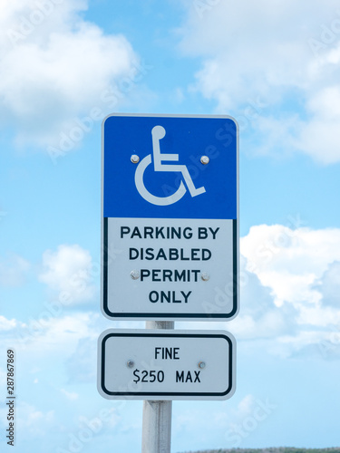 Disabled Parking Permit Sign ($250 Fine) on Blue Sky in the State of Florida.