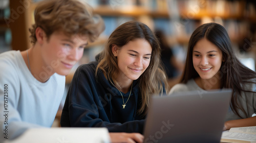Disagreement in Study Group: Students in a library clashing over a project with a laptop a notebook and a quiet study room with bookshelves. three quarter wide angle cinematic