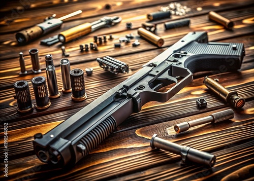 firearm, disassemble, weapon, component, gun, mechanic, assembly, dismantling, repair, maintenance, tool, workshop, table, closeup, detailed, photo, education, training, safety, security, metal, hardware, machinery, engineering, technology, precision, accuracy, detail, texture, background, dark, wood, lighting, sharp, sharpened, labeled, organised, illustration, diagram
