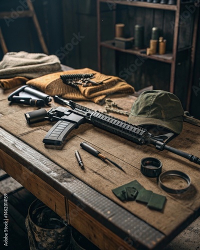 Disassembling rifles and tools on a wooden table gritty military workshop detailed equipment layout industrial environment close-up perspective military vibe for gun maintenance