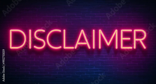 Disclaimer word lettering glowing with neon light on dark brick wall background