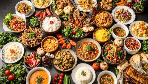 Discover culinary diversity in this vibrant flat lay image showcasing a colorful assortment of global dishes and ingredients