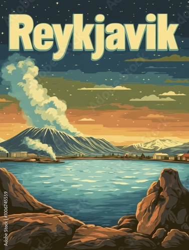 reykjavik, travel, retro, poster, volcano, nature, landscape, sunset, water, reflections, city, mountain, adventure, tour tourism, scenic, colours, culture, iceland, discovery, wanderlust, beauty, exploration, skyline, calmness, destination, historical, charme, art, relaxing, vista, heritage, evening, seascape, unspoiled, natural, peaceful, life events, hill, captivating