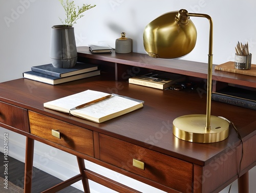 Discover Sleek Mid Century Modern Writing Desk with Elegant Brass Lamp for Stylish Office Inspiration