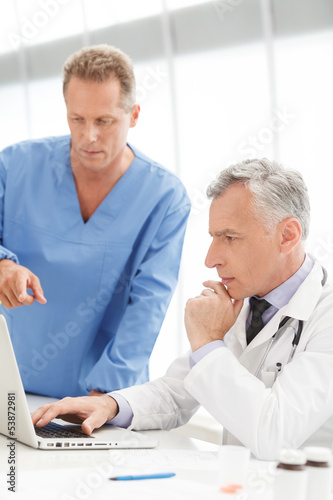 50s, 60s, adult, advise, caucasian, communication, computer, concentrated, confidence, doctor, expertise, general practitioner, grey hair, hospital, labcoat, laptop, looking, male, medical equipment, medicine, man, people, pill, pointing, professional occupation, sitting, standing, stethoscope, surgeon, team, teamwork, two people, uniform, vertical, white, writing