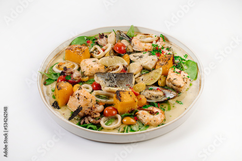 Dish of boiled dorada fish with shellfish, vegetables and herbs