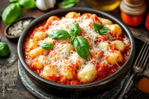 Dish of typical italian potato gnocchi with tomato sauce and cheese, ai