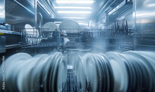 plate, stainless steel, clean, dishwasher, machine, eatery, kitchen, steam, white, utensil, row, industrial, shine, reflective, lighting, rack, organised, sanitation, hygiene, washing, dishwashing, sparkling, stack, closeup, modern, detail, commercial, bright, metal