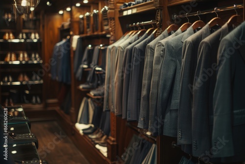 display, sophisticated, luxurious, suit, arranged, high-end, clothing, boutique, craftsmanship, style, refined, setting, elegant, fashion, tailored, premium, quality, apparel, upscale, formal, exclusive, chic, designer, menswear