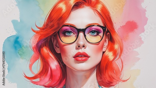 woman, eyeglass, portrait, editorial, watercolor, contemporary, beauty, fashion, posing, make-up, eyeshadow, red lips, red hair, bob, studio, abstract, background, female, adult, pink, yellow, blue, green, peach, vibrant, stylised, single, bright, fashionable, artistic, colourful, expression, confident, isolated