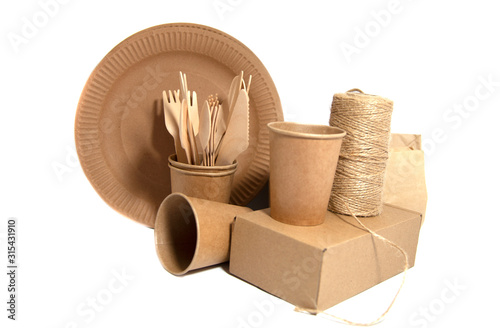 .Disposable dishes, paper dishes. tableware for a picnic and camping, tableware on a white empty background, zero plastic, saving the planet.
