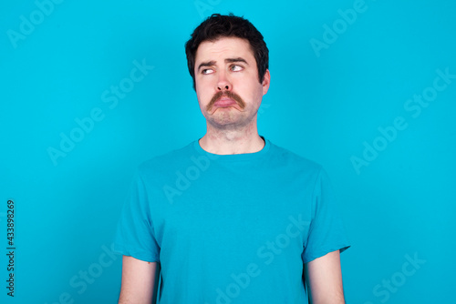 Dissatisfied young handsome Caucasian man with moustache wearing blue t-shirt against blue background purses lips and has unhappy expression looks away stands offended. Depressed frustrated model.
