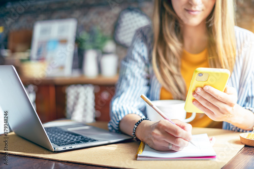 Distance learning online education and work. Business woman writes in notebook on desk. Happy and smiling girl working from home office kithcen and drinking coffee. Using computer and smart phone