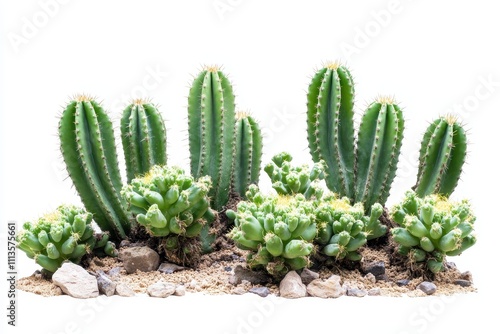 Distinct clusters of green cactus plants with thick spiky stems and growing from sandy or rocky soil