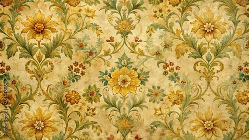 Distressed floral flock wallpaper with yellowed edges and worn-out patterns, featuring intricate designs of flowers and foliage in a vintage style , floral, eerie