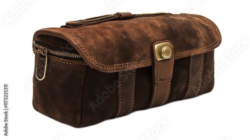 Distressed Leather Toiletry Bag: A rugged and stylish distressed leather toiletry bag with a zipper closure, buckle clasp, and a vintage aesthetic.